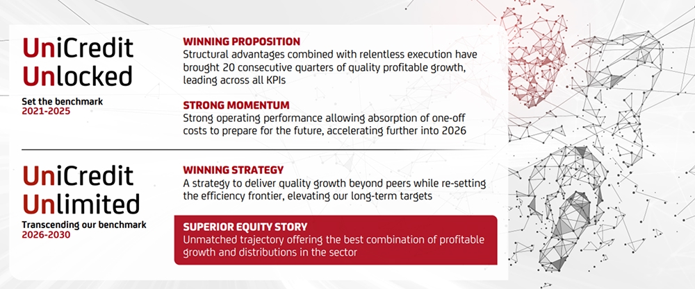 Over the past five years, UniCredit Unlocked released the trapped potential within our organisation, allowing us to move from laggard to leader and set a new benchmark for European banking. With 20 consecutive quarters of quality, profitable growth, unmatched efficiency and sector‑leading distributions, we are now ready to enter our next chapter: UniCredit Unlimited.